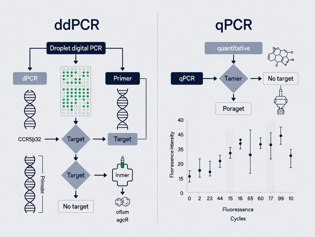 This article provides a comprehensive comparison of droplet digital PCR (ddPCR) and quantitative PCR (qPCR) for detecting the CCR5Δ32 mutation, a critical genetic variant conferring resistance to HIV infection.