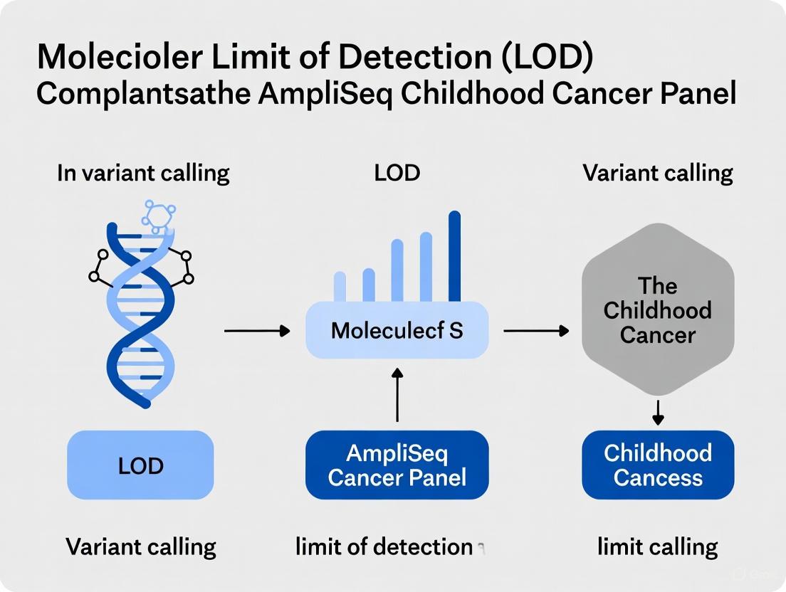 This article provides a detailed examination of the Limit of Detection (LOD) for the AmpliSeq™ for Illumina® Childhood Cancer Panel, a targeted NGS solution for pediatric malignancies. Aimed at researchers and drug development professionals, it covers foundational LOD principles, established performance metrics including 98.5% sensitivity for DNA variants at 5% VAF and 94.4% for RNA fusions, and methodological considerations for assay implementation. The content further addresses troubleshooting low-VAF variants, optimizing input samples, and presents rigorous validation data alongside comparisons with other pediatric cancer panels. The synthesis of this information is crucial for robust assay deployment, accurate data interpretation in clinical research, and informing the development of future diagnostic and therapeutic strategies.