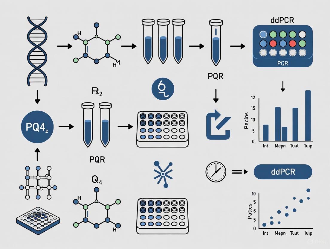 A 2025 study in Scientific Reports directly compared ddPCR and qPCR for measuring copy number variations (CNVs) against the gold standard, pulsed field gel electrophoresis (PFGE). The results demonstrated 95% concordance between ddPCR and PFGE, whereas qPCR showed only 60% concordance, often underestimating copy numbers at higher values [3]. This underscores dPCR's superior accuracy for applications like CNV analysis in heterogeneous samples.