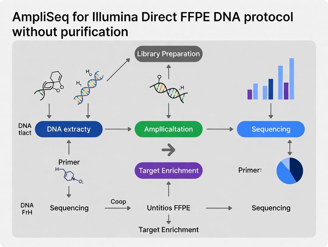 The AmpliSeq for Illumina Direct FFPE DNA protocol provides a targeted sequencing solution for challenging formalin-fixed, paraffin-embedded (FFPE) tissue samples. This approach enables researchers to generate high-quality sequencing libraries without requiring DNA purification after amplification, streamlining the workflow for degraded FFPE samples commonly encountered in cancer research and drug development. The method leverages highly multiplexed PCR technology to amplify specific genomic regions of interest, making it particularly valuable for profiling cancer biomarkers and other clinical targets from limited and degraded sample materials [14].